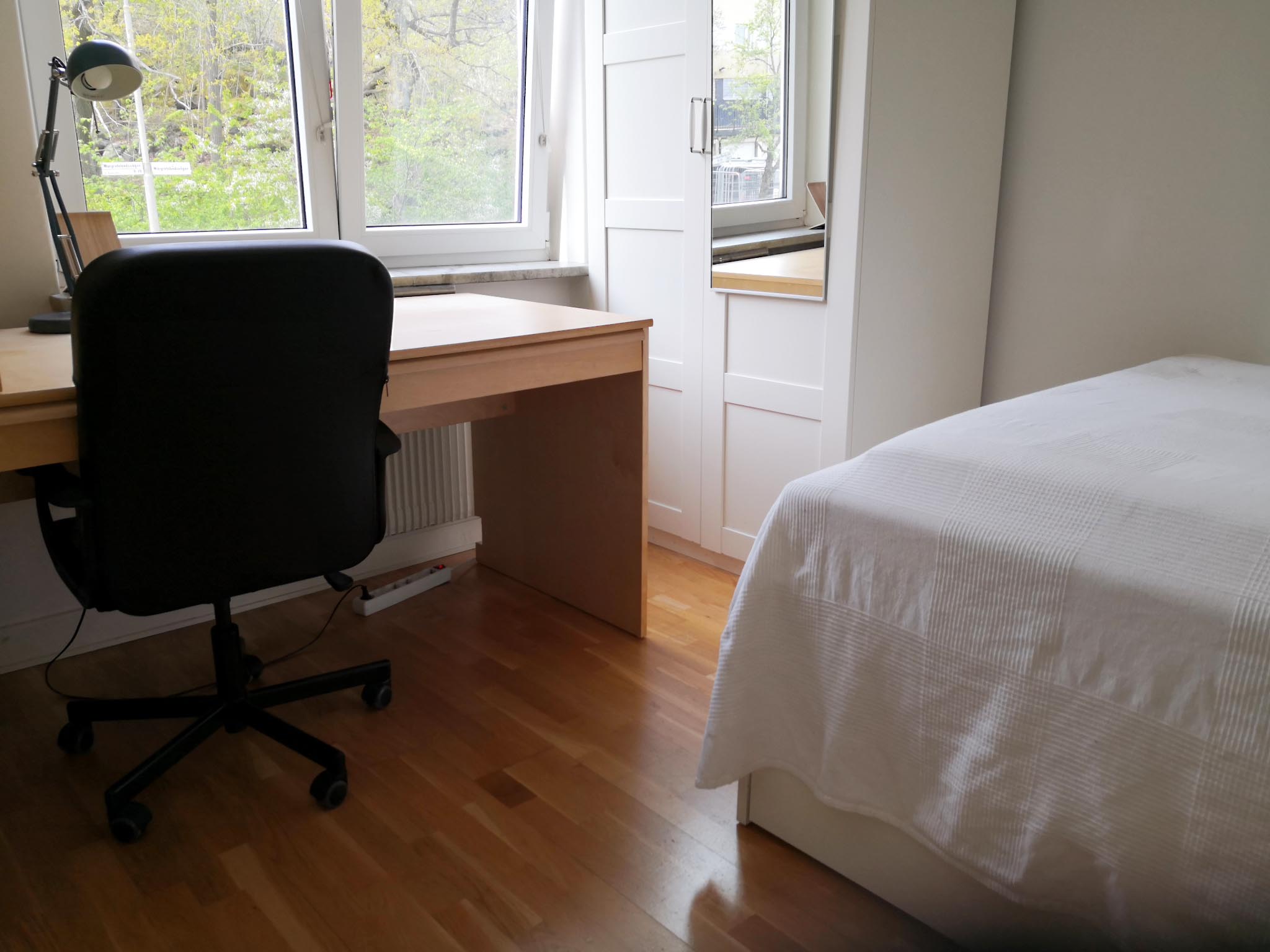 Uthyres från 1 mars 2026 till 10 Juni eller längre till heltidsstudent eller till gäst med heltidsanställning. Mysigt, ljust, sjönära och centralt rum i Stockholm (Traneberg) där lugn och gröna ytor kombineras med absolut närhet till Stockholm City, restauranger, caféer, shopping, tåg, bussar, tunnelbana m.m. 8 minuters resa till Stockholm City med tunnelbana eller cykel. Rummet ligger i en 3-rumslägenhet och delas med värden. Inga andra hyresgäster finns i lägenheten. Det är lätt att vara privat eftersom rummet är delvis avskilt från de andra rummen i lägenheten. Dörren till rummet kan låsas med nyckel. Det finns en stor bekväm säng i rummet, ett stort skrivbord, en stor garderob och andra förvaringsplatser. Delad toalett, dusch och kök finns i nära anslutning till rummet. Lägenheten ligger 200 meter från vackra Tranebergs Strand med möjlighet till bad, båtliv, promenader, jogging, restauranger m.m. I nära anslutning till lägenheten ligger också Tranebergs Fritidspark med stora gräsytor, grillplats, utegym, tennisbana (utan avgift) med mera. Några minuters promenad bort från lägenheten ligger Alviks Station där man kan ta sig till de flesta platser i Stockholm med tunnelbana, lokaltåg eller buss. Från Alviks tunnelbanestation reser man till Stockholms Central på några minuter. Gäster har tillgång till trådlöst höghastighetsinternet, kök, toalett, dusch, tvättstuga, parkering (parkeringsavgift), etc. Rummet uthyres endast till icke-rökare.