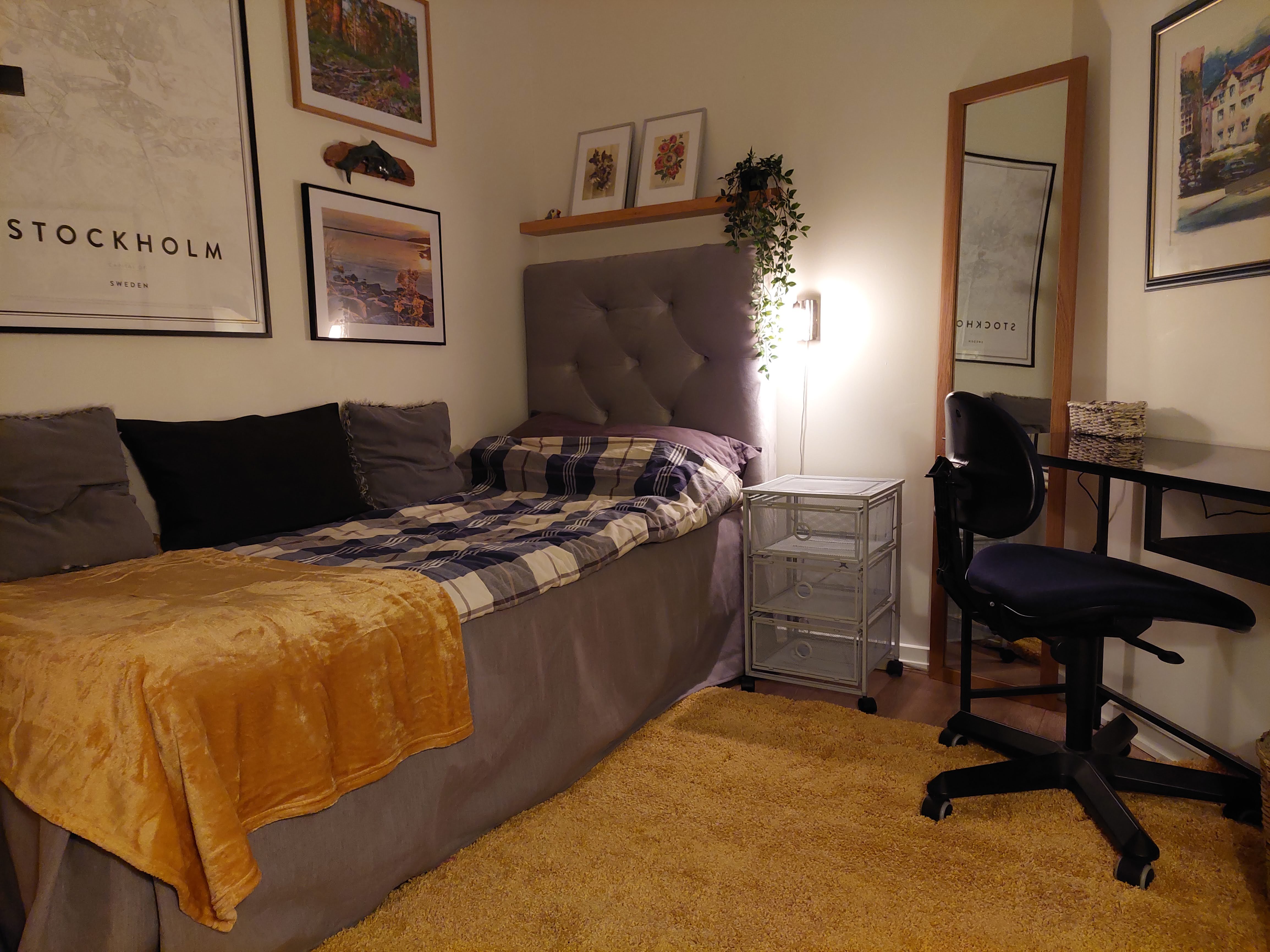 Litet men ljust och fräscht, möblerat rum i Bromma med välinredd garderob, skön resårsäng, skrivbord m.m., delat kök och badrum i 3-rumslägenhet i låghus – tvättstuga, trivsam gård med grillplats. Fem min till t-bana Islandstorget/buss 113 till Sundbyberg/Solna, 24 min till T-centralen. Tre min promenad till centrum med matbutik, bibliotek, apotek, café m.m. Lugnt område med fina promenadstråk utmed vattnet, klippor och stränder. Sökes: ansvarsfull kvinna, med ordnad ekonomi (arbetsintyg/CSN-/studieintyg) - rökfri, djurfri och ordningsam (fester och övernattningar undanbedes). Förskottshyra, deposition samt egen hemförsäkring med allrisktillägg. I hyran ingår el, värme, trådlöst internet/fiber, toapapper, tvål och diskmedel. Ett stort plus är om du gillar/har lite vana vid hundar. Här bor en liten, vänlig hund (hårar ej, allergivänlig ras, hundvakt finns), som ser fram emot en ny flockmedlem. Jag hyr helst ut för längre tid. Mejla och berätta om dig själv och fråga om det är ngt du undrar över. ------------------------------------------------ Bright and fresh, furnished room in Bromma, well equipped wardrobe, comfortable box-spring bed, desk, etc., access to kitchen and bathroom in 3-room apartment in low building - close to laundry, nice yard with barbecue area. Five minutes to metro Islandstorget / bus 113 to Sundbyberg / Solna, 24 minutes to T-centralen. Three min walk to small center with shops, library, pharmacy, cafe m.m. Nice, quiet area with beautiful walking paths along the water, cliffs and beaches. Wanted: responsible woman, who keeps order around, orderly finances (work certificate / CSN / study certificate) - smoke-free, animal-free (parties and people sleeping over are avoided). Advance rent, security deposit and your own home insurance with all-risk supplement. The fee includes electricity, heating, wireless internet / fiber, toilet paper, washing up liquid. You should preferably like, or be used to, dogs. Here lives a small, friendly dog (allergy-friendly breed, does not shed, there is a dog sitter), who is looking forward to a new member of the herd. I prefer to rent out for a longer period. Tell me about yourself and don´t hesitate to ask if you have any questions.